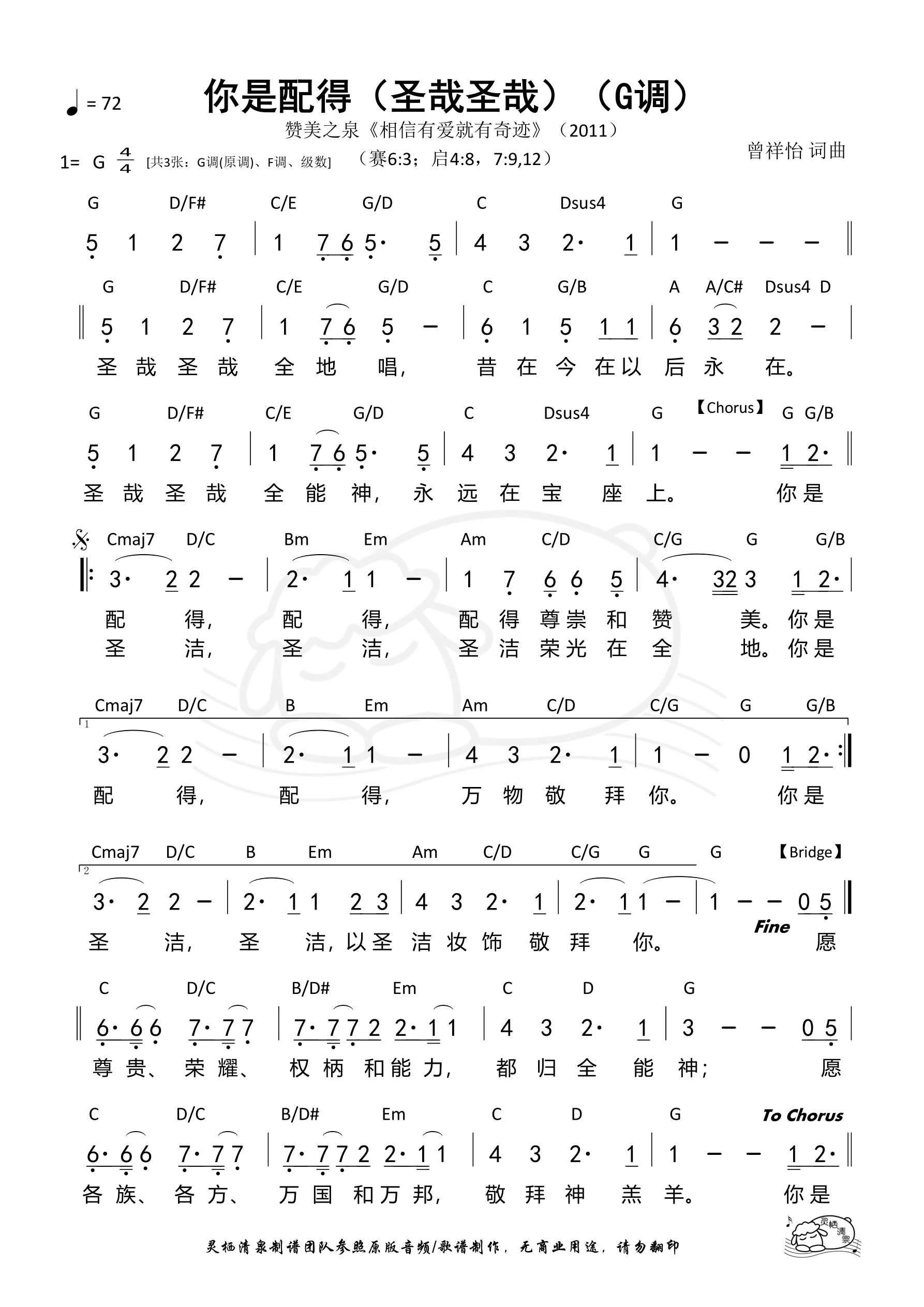 词曲:曾祥怡 歌手:赞美之泉 专辑:相信有爱就有奇迹 发行:2011 Verse(End) 圣哉圣哉全地唱 昔在今在以后永在 圣哉圣哉权能神 永远在宝座上 Chorus 你是配得 配得 配得尊崇和赞美 你是配得 配得 万物敬拜你 你是圣洁 圣洁 圣洁荣光在全地 你是圣洁 圣洁 以圣洁妆饰敬拜你 Bridge 愿尊贵 荣耀 权柄和能力 都归权能神 原各族 各方 万国和万邦 敬拜神羔羊