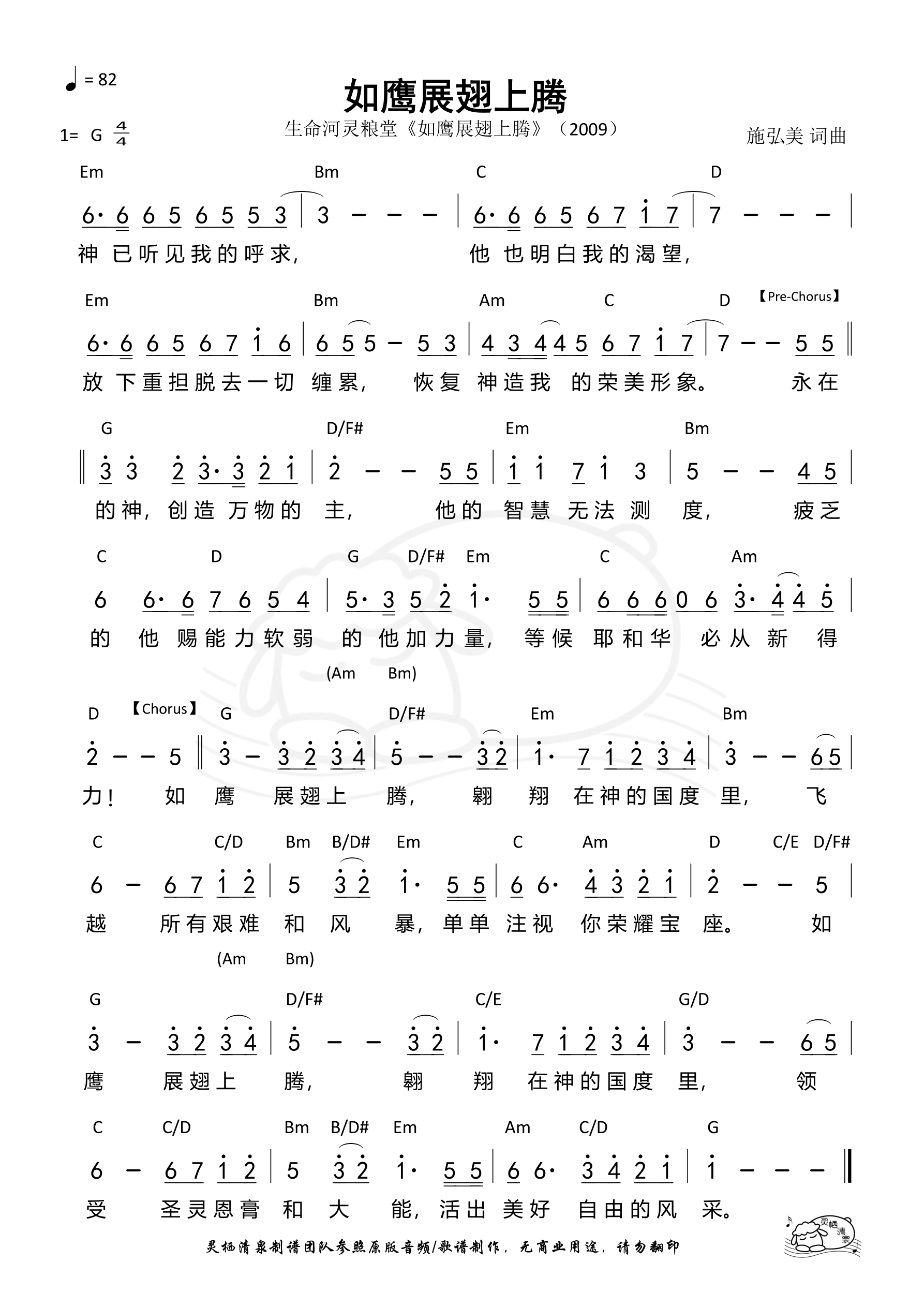 Verse 神已听见我的呼求 他也明白我的渴望 放下重担脱去一切缠累 恢复神造我的荣美形像 Pre-Chorus 永在的神创造万物的主 他的智慧无法测度 疲乏的 他赐能力 软弱的 他加力量 等候耶和华必从新得力 Chorus 如鹰展翅上腾 翱翔在神的国度里 飞越所有艰难和风暴 单单注视你荣耀宝座 如鹰展翅上腾 翱翔在神的国度里 领受圣灵恩膏和大能 活出美好自由的风采