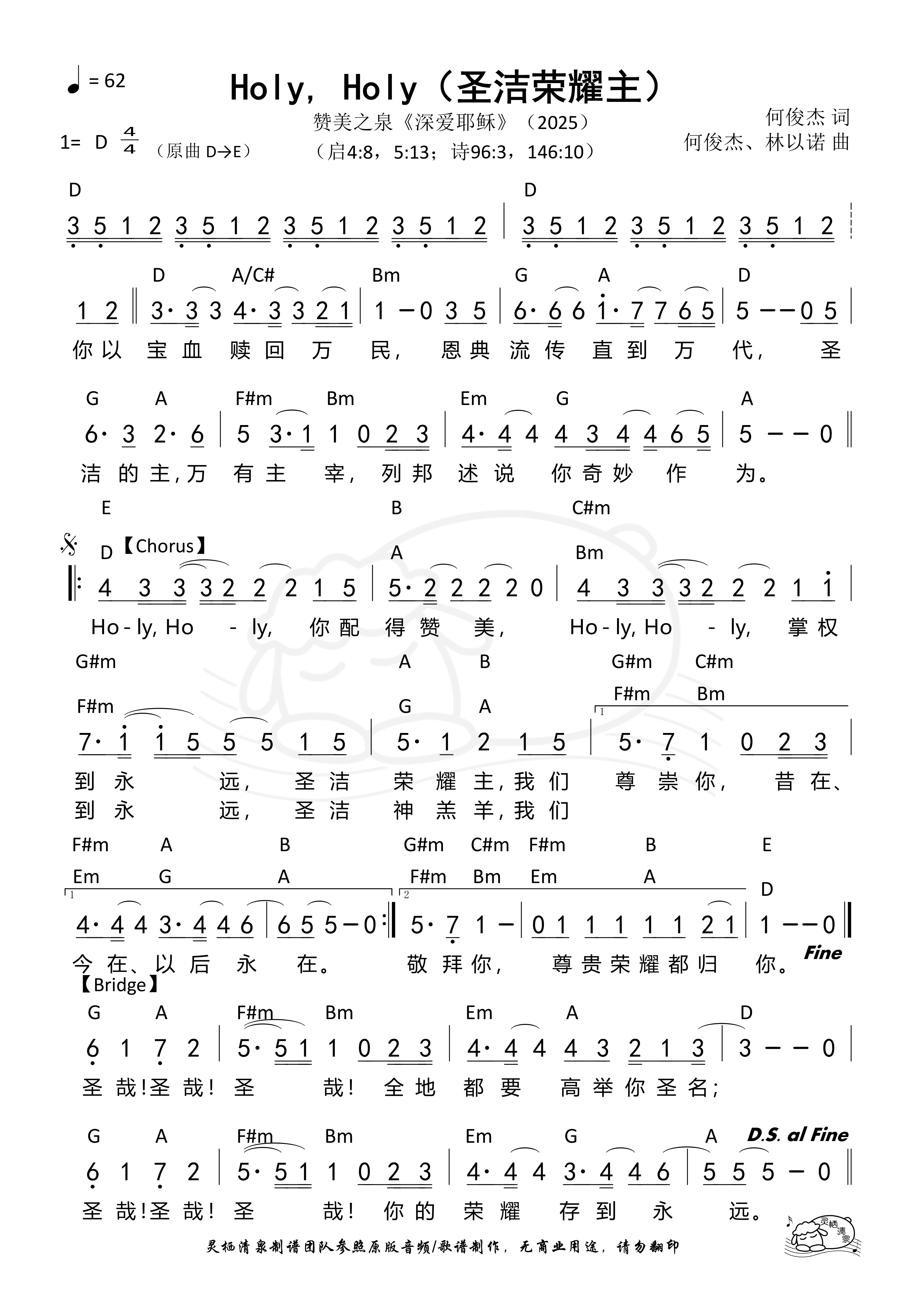 作词:何俊杰 作曲:何俊杰 林以诺 歌手:赞美之泉 专辑:深爱耶稣 发行:2025 Verse 你以宝血 赎回万民 恩典流传 直到万代 圣洁的主 万有主宰 列邦述说你奇妙作为 Chorus Holy holy 你配得赞美 Holy holy 掌权到永远 圣洁荣耀主 我们尊崇你 昔在 今在 以后永在 Holy holy 你配得赞美 Holy holy 掌权到永远 圣洁神羔羊 我们敬拜你 尊贵荣耀都归你 Bridge 圣哉 圣哉 圣哉 全地都要高举你圣名 圣哉 圣哉 圣哉 你的荣耀存到永远
