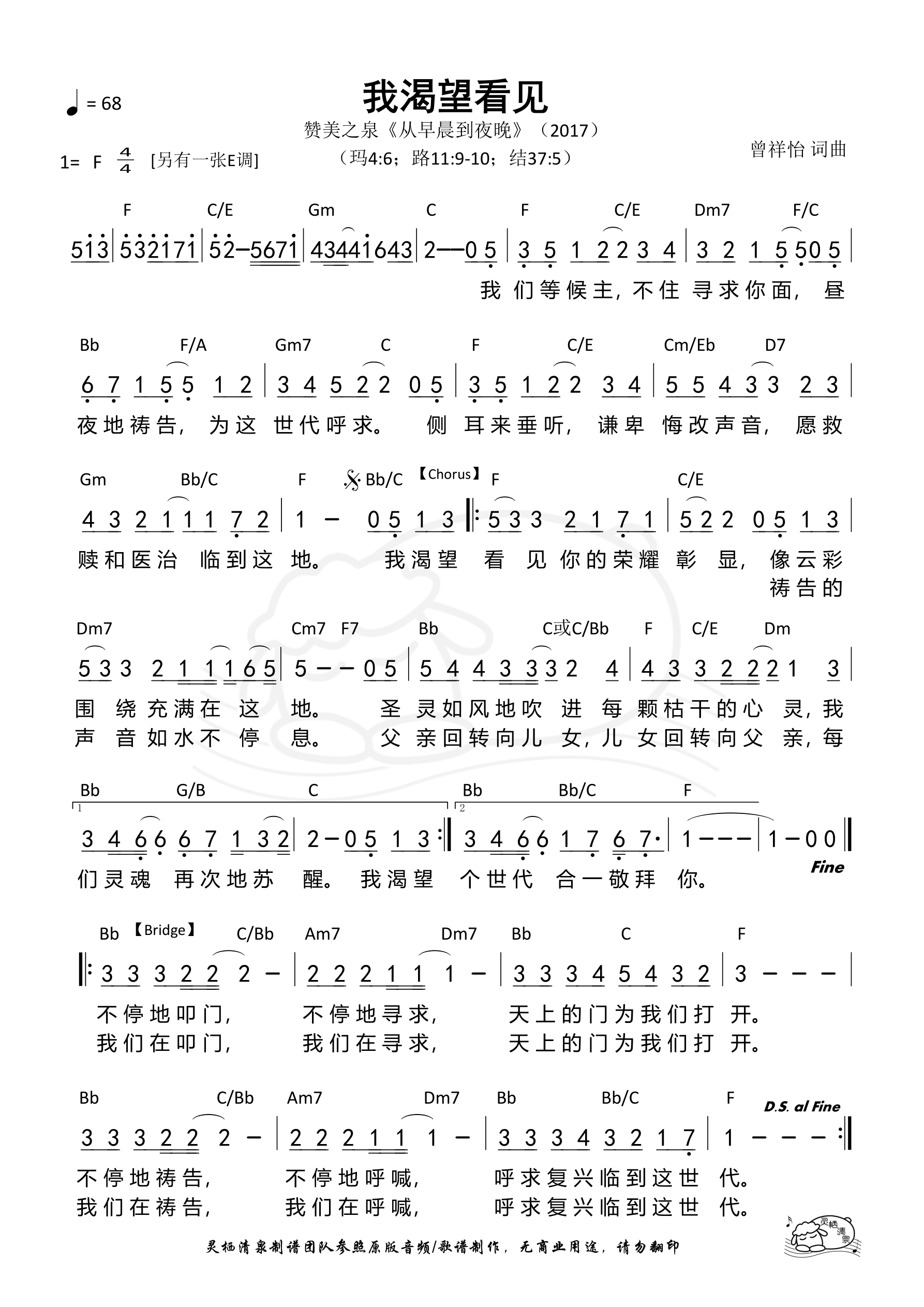 词曲:曾祥怡 歌手:美之泉 专辑:从早晨到夜晚 发行:2017 Verse 我们等候主 不住寻求你面 昼夜地祷告 为这世代呼求 侧耳来垂听 谦卑悔改声音 愿救赎和医治 临到这地 Chorus 1 我渴望看见 你的荣耀彰显 像云彩围绕 充满在这地 圣灵如风地吹进 每颗枯干的心灵 我们灵魂再次地苏醒 Chorus 2 我渴望看见 你的荣耀彰显 祷告的声音 如水不停息 父亲回转向儿女 儿女回转向父亲 每个世代合一敬拜你 Bridge 1 不停地叩门 不停地寻求 天上的门为我们打开 不停地祷告 不停地呼喊 呼求复兴临到这世代 Bridge 2 我们在叩门 我们在寻求 天上的门为我们打开 我们在祷告 我们在呼喊 呼求复兴临到这世代