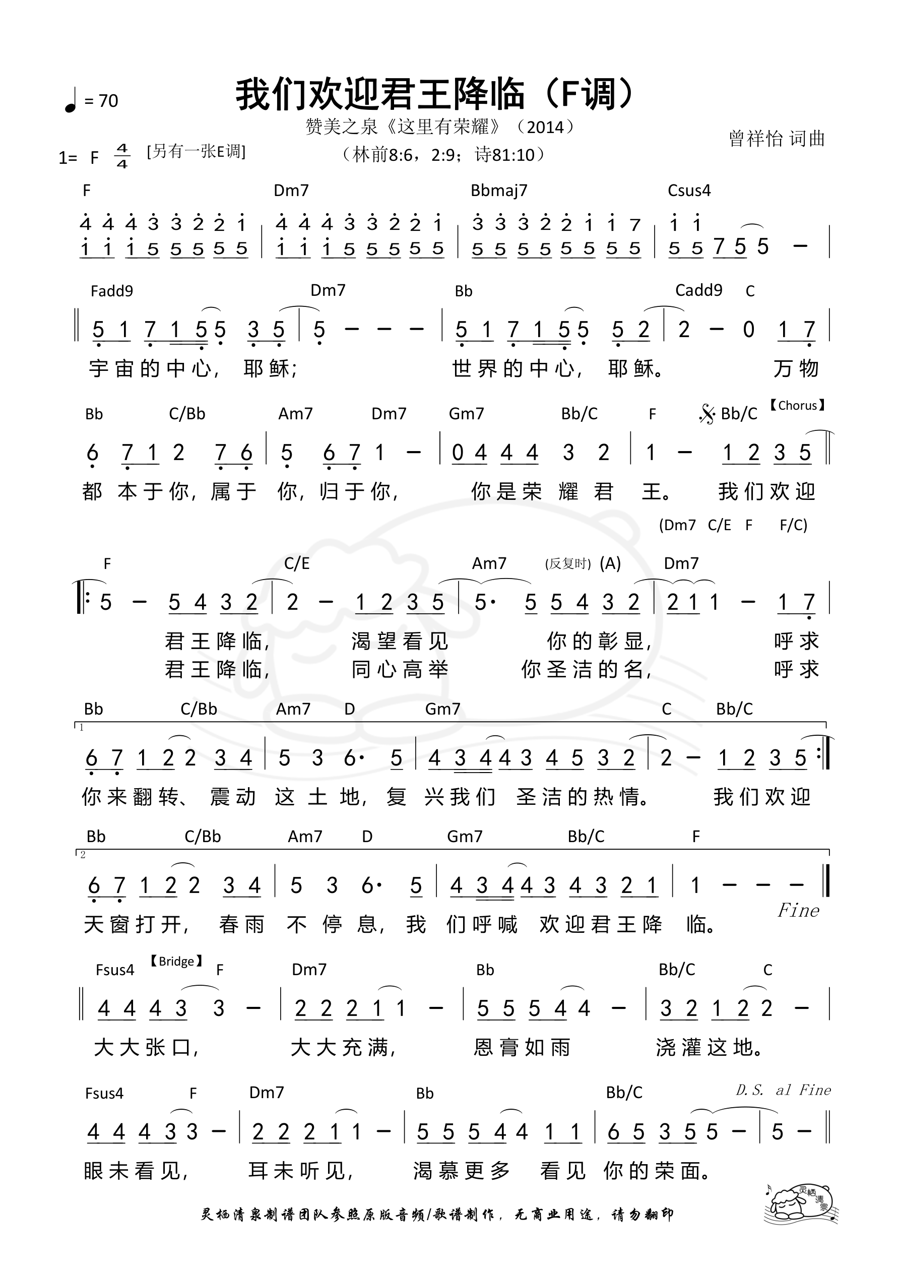 词曲:曾祥怡 歌手:赞美之泉 专辑:这里有荣耀 发行:2014 Verse 宇宙的中心 耶稣 世界的中心 耶稣 万物都本于你 属于你 归于你 你是荣耀君王 Chorus 我们欢迎君王降临 渴望看见你的彰显 呼求你来翻转 震动这土地 复兴我们圣洁的热情 我们欢迎君王降临 同心高举你圣洁的名 呼求天窗打开 春雨不停息 我们呼喊欢迎君王降临 Bridge 大大张口 大大充满 恩膏如雨 浇灌这地 眼未看见 耳未听见 渴慕更多看见你的容面