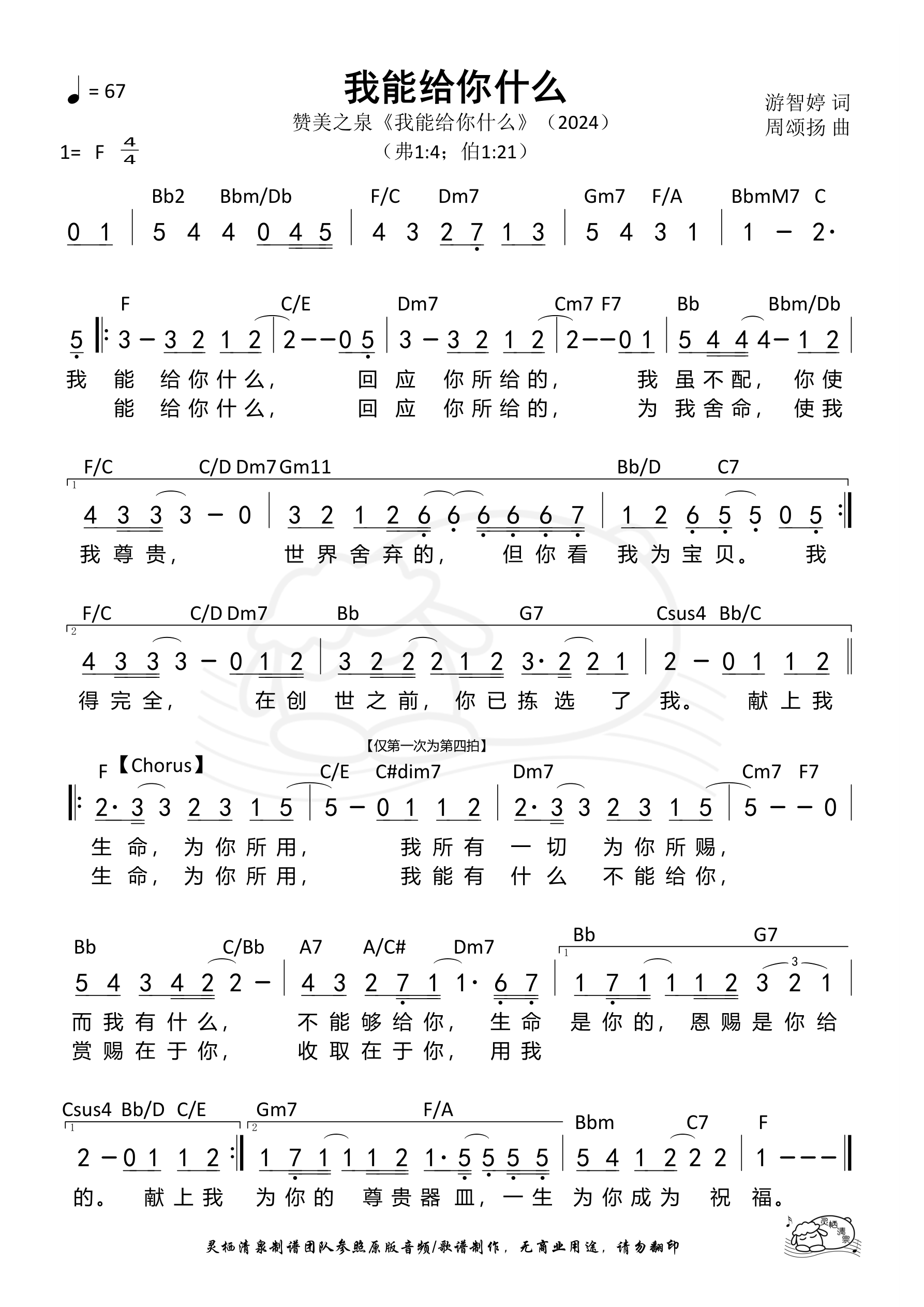 作词:游智婷 作曲:周颂扬 歌手:赞美之泉 专辑:我能给你什么 发行:2024 Verse 1 我能给你什么 回应你所给的 我虽不配 你使我尊贵 世界舍弃的 但你看我为宝贝 Verse 2 我能给你什么 回应你所给的 为我舍命 使我得完全 在创世之前 你已拣选了我 Chorus 献上我生命为你所用 我所有一切为你所赐 而我有什么不能够给你 生命是你的 恩赐是你给的 献上我生命为你所用 我能有什么不能给你 赏赐在于你 收取在于你 用我为你的尊贵器皿 一生为你成为祝福